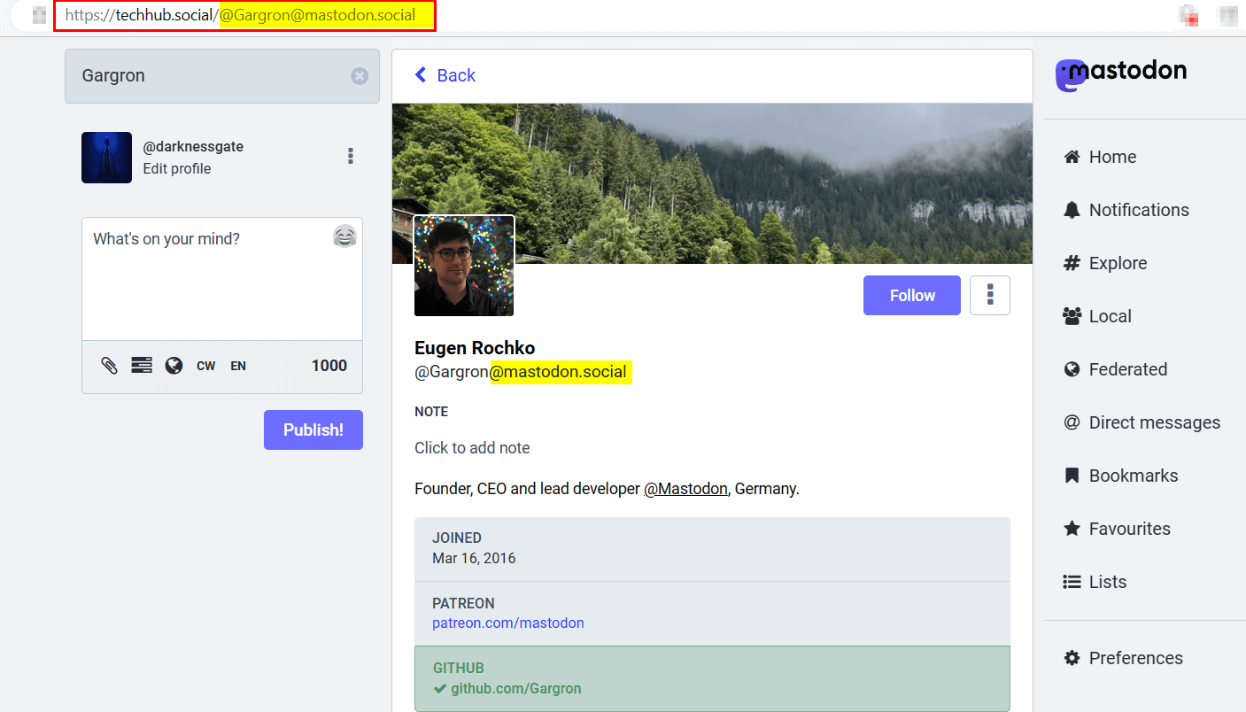 To view the Mastodon profile of a user on a different instance than you, such as if you are on @techhub.social and the user is on @mastodon.social, you will need to mention both their Mastodon username and instance name. For example, you would mention the user as @Gargron@mastodon.social (see Figure 2).